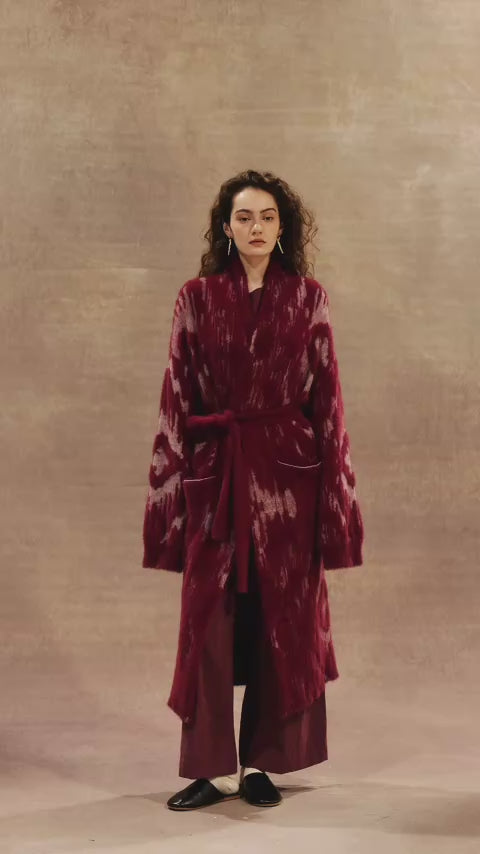 Aus einer Seiden-Mohair-Mischung gesponnen, fließt der Mantel mit einem sanften Glanz und taktiler Tiefe – jeder Webstich hallt den Rhythmus des Webstuhls wider. Die Wickelform schließt mühelos an der Taille und vermittelt sowohl Intimität als auch ruhige Stärke.