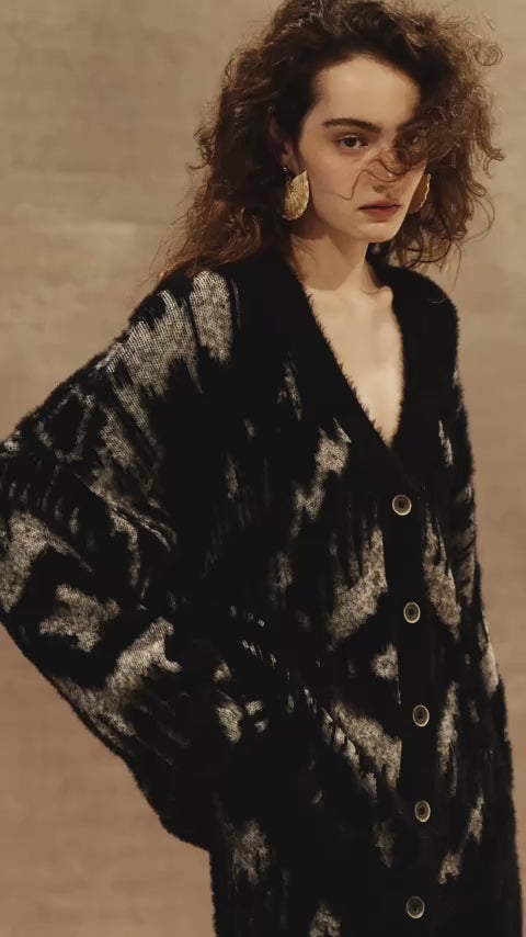 深い黒と土色のアブストラクトなパターンが特徴で、このセットは芸術的なエッジと究極の快適さを融合しています。チューブトップのニットテクスチャー、ボタンでアクセントをつけたVネックカーディガン、フローティングなワイドレッグパンツが温かみのあるスタイリッシュなシルエットを作り出しています。家でのんびり過ごす時も、大胆なストリートウェアのレイヤリングにも、このコインワイズ可能なセットは冬の居心地の良さを再定義します。