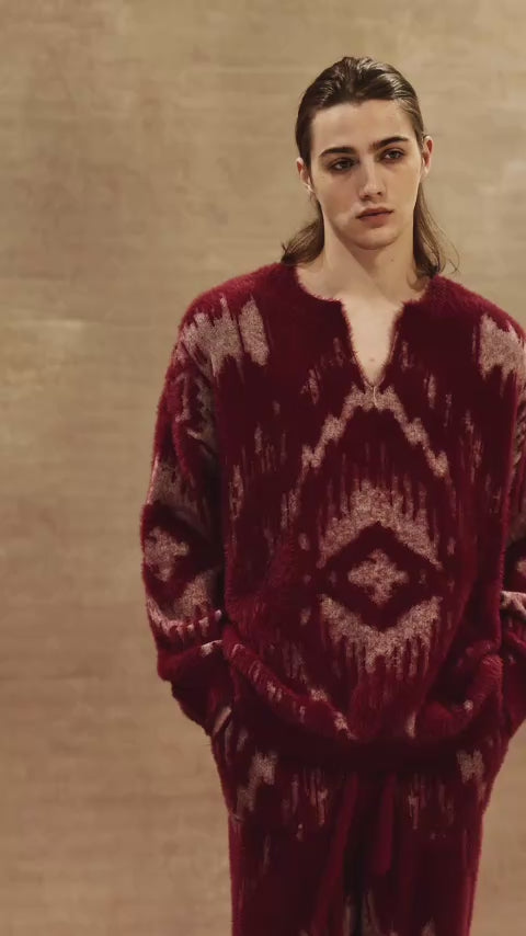 The relaxed silhouette features an extended V-neckline and fine ribbed edges, enhancing comfort while elongating the frame. Textural contrast and tonal variation create a sense of quiet movement across the surface — a reflection of woven poetry in motion.